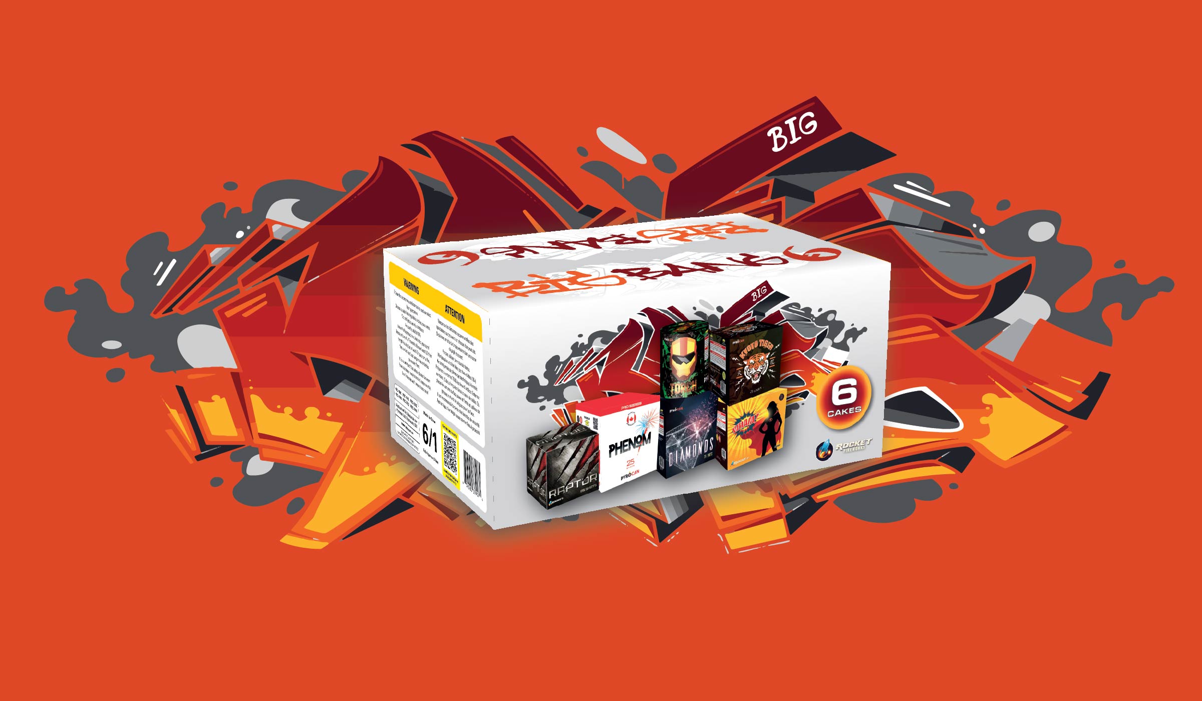 Este combo de fuegos artificiales trae seis cakes o “tortas”. Este tipo de fuego de artificio comprende varios efectos que también es conocido como dispositivo de múltiples tubos. Todos los efectos están conectados entre sí por un fusible de alta velocidad. Como argumento de venta en este caso, nuestro cliente apeló al Big Bang: utilizamos una foto de graffiti como fondo que expresa ambas palabras con los grafismos propios de la pintura callejera moderna. Ese “Big Bang 6” se refiere al mega-combo que ofrece la caja de Rocket Fireworks, haciendo alusión a las grandes explosiones que producirán estas 6 tortas.