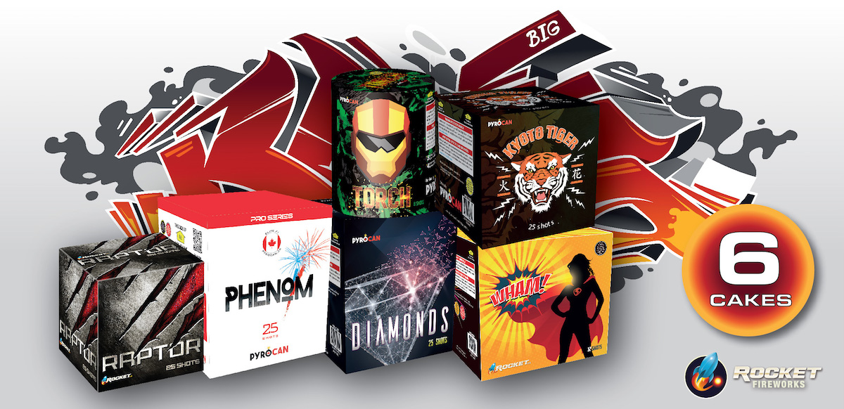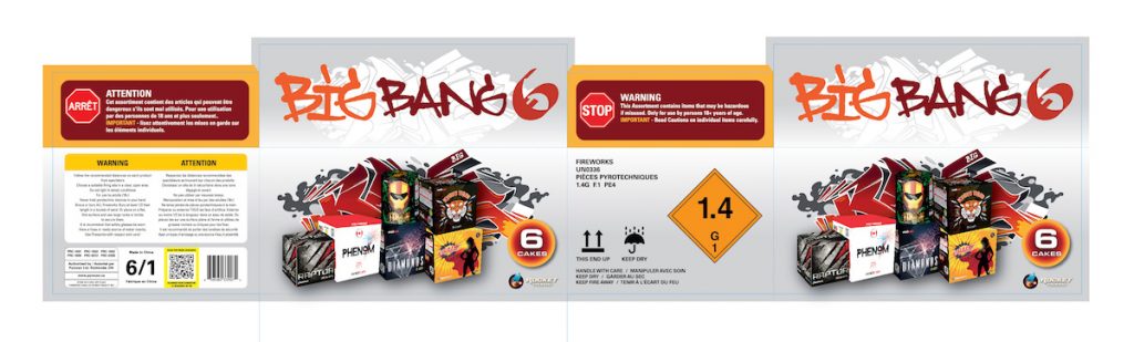 Como argumento de venta en este caso, nuestro cliente apeló al Big Bang: utilizamos una foto de graffiti como fondo que expresa ambas palabras con los grafismos propios de la pintura callejera moderna. Ese “Big Bang 6” se refiere al mega-combo que ofrece la caja de Rocket Fireworks, haciendo alusión a las grandes explosiones que producirán estas 6 tortas.